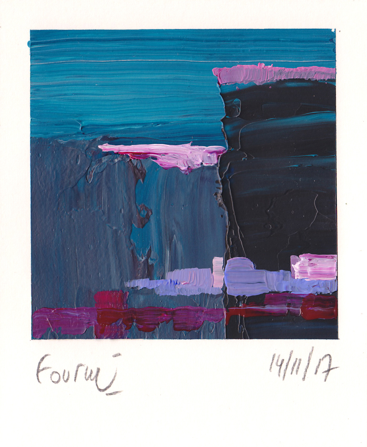 The project Colors & Moments I started in 2013 had a break for 2 years when I was busy on the Art Direction of the animated Movie Bigfoot Junior. I get back to it in September 2017 and rethought it with an other structure, less vertical. I choose one moment by day and express it with colors and textures. Adding even more light. Later I choose to change the size too (Squared: 10x10cm or 7,5x7,5 cm Landscape: 9,5x11cm): I took the Polaroid dimensions as reference to accentuate the instant feeling of the painting. Gouaches and acrylic are still my techniques...