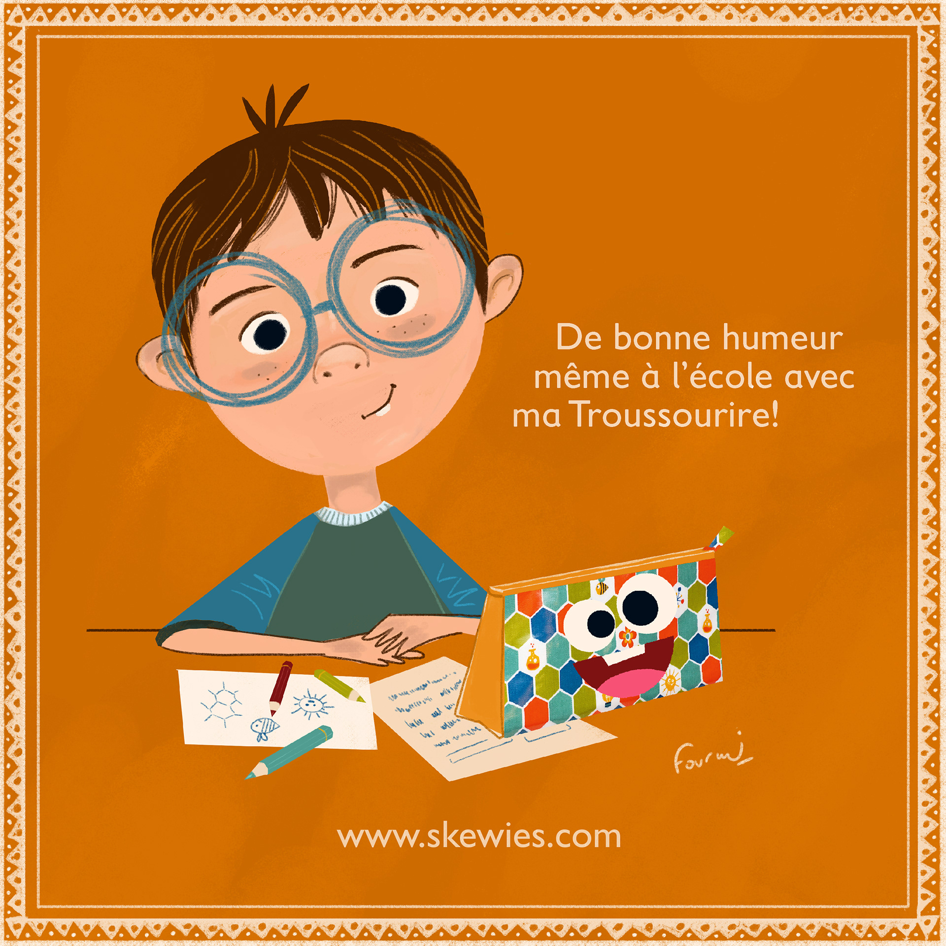 Some illustrations for the advertising campaign of the brand Les Skewies. Funny accessories for kids ( sketchbooks, bags, pouches,...) www.skewies.com